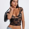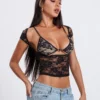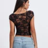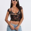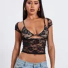 Women’s Lace Tops Vintage Cap Sleeve Low Cut Slim Fit T-Shirts + Sleeveless Bralette Set Summer Clothes